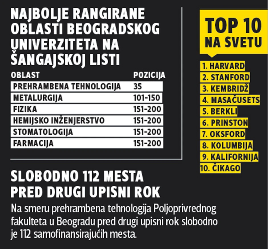Koliko je to veliki uspeh, pokazuje činjenica da se na prestižnoj Šangajskoj listi 500 najboljih univeriteta nalazi svega dva odsto svih univerziteta na svetu. Tih 500 univerziteta rangirano je u ukupno 47 naučnih oblasti, a kada se radi o prehrambenoj tehnologiji, Beogradski univerzitet se nalazi na izuzetnom 35. mestu. Ovaj rezultat i te kako dobija na značaju ako se ima u vidu da je od top 10 naboljih na svetu, jedino Masačusets bolje rangiran od Beograđana u oblasti prehrambene tehnologije. Recimo, Harvard, koji je ubedljivo prvi na Šangajskoj listi, ili Oksford, nalaze se daleko iza nas.