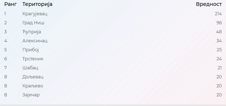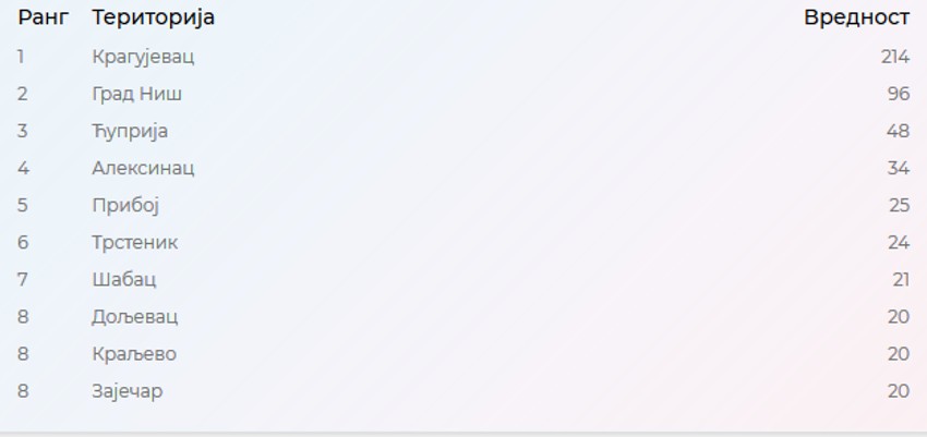 Broj ljudi u samoizolaciji u Kragujevcu, koji ima nešto više od 150.000 stanovnika je 214, dok je u Beogradu svega njih 17. Na drugom mestu ove liste je Niš. U gradu koji broji oko 186.000 stanovika u samoizolaciji je 96 osoba, što je znatno manje nego u Kragujevac. Treće mesto zauzima Ćuprija, koja je u jednom periodu takođe bila žarište, a sada ima 48 ljudi u samoizolaciji.