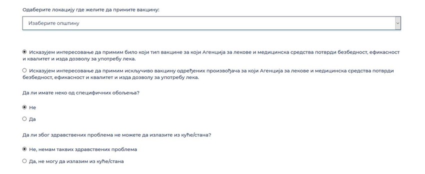 Nakon što unesu svoje podatke, građan treba da se izjasne o tome da li žele bilo koji tip vakcine koji je u upotrebi u Srbiji ili žele da se vakcinišu određenom vakcinom.
