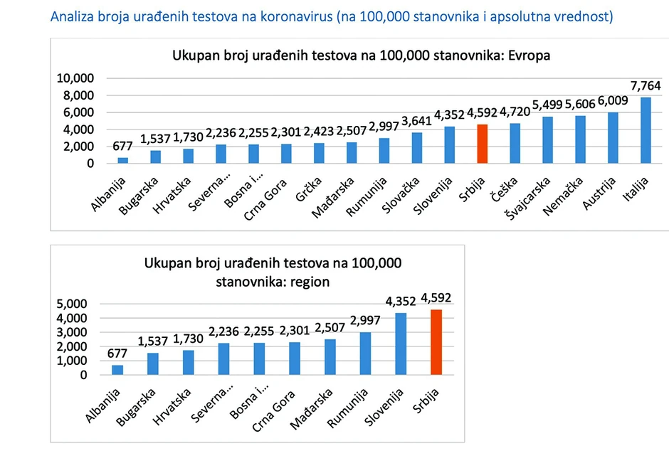 Broj zaraženih ne pada, ali mesta panici, tvrde stručnjaci, nema. Jedan od pokazatelja zašto u Srbiji ima više zaraženih nego u zemljama regiona je i taj što se ovde mnogo više ljudi na dnevnom nivou testira. Samo u jednom danu ove nedelje testirano je 6.098 ljudi, dok je u istom danu broj testiranih u Crnoj Gori bio tek 177, a u Hrvatskoj 272.