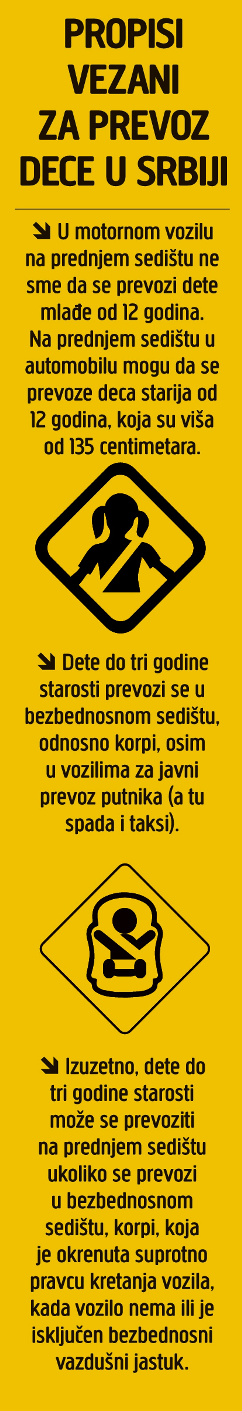 - Treba uzeti u obzir i to da odrasla osoba, u momentu kada oseti da se približava opasnost, brže reaguje od deteta, koje nije svesno šta ga čega. Ne treba zaboraviti da su dečija tela mnogo osetljivija, krhkija. Majka kada uzme bebu u naručje, drži joj vrat, jer ova ne može sama da drži glavicu. Upravo zbog toga su sedišta za najmlađe su okreneta u vozilima, da prilikom udarca, detetu ne bi bio povređen vrat - objašnjava prof. dr Vujanić.