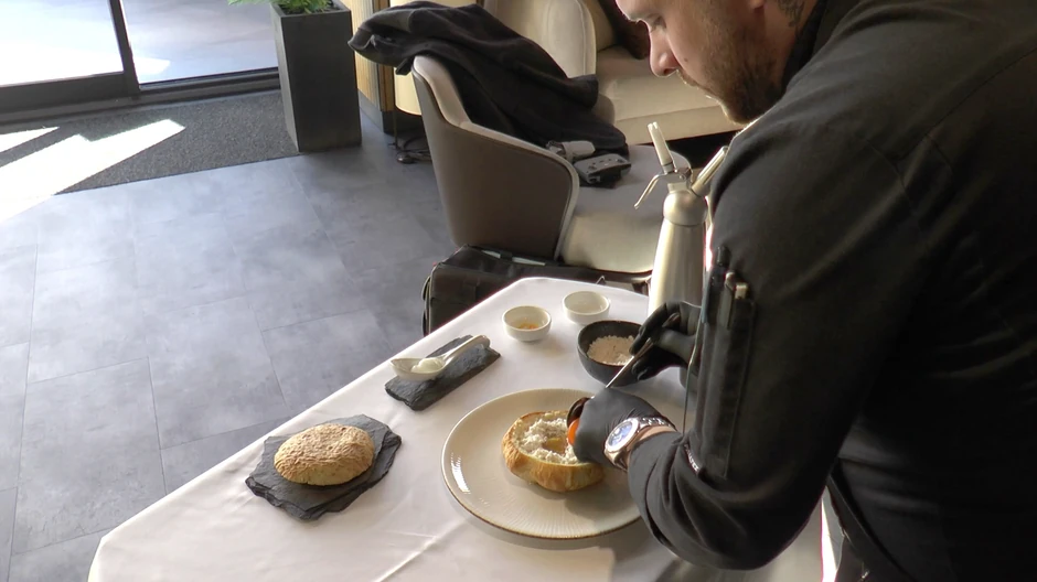 - Sve su to sastojci koji čine pravu komplet lepinju, samo predstavljeni u novom obliku. Trudimo se da sve sirovine budu autentične. Lepinju prvo mesimo od brašna koje uzimamo sa lokalne vodenice, zatim u nju stavljamo mladi kajmak i belance. Zamutimo i pečemo da bude srednje pečeno. Na tu osnovu potom idu prah i sfera od pretopa, žumance koje je odležalo u soli, a preko se dodaje espuma od mladog kajmaka. Za dekoraciju koristimo prah od pretopa - objašnjava proces rada kuvar iz Užica.