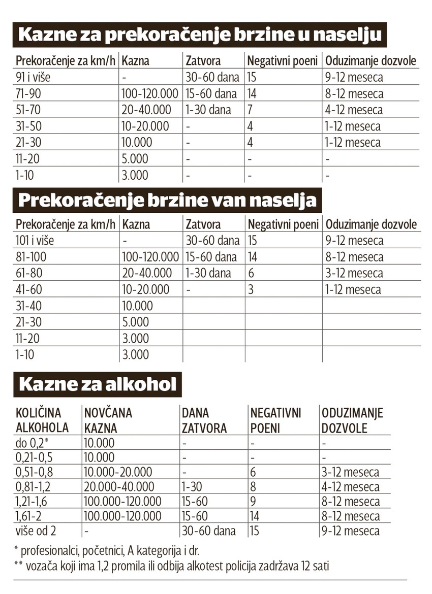 Dozvoljen nivo alkohola u krvi za vozače spušten je sa 0,3 na 0,2, a kazne su udvostručene. Novčane kazne za vožnju pod dejstvom alkohola sada će iznositi od 10.000 do 120.000 dinara, a predviđene su i zatvorske kazne (vidi tabelu)