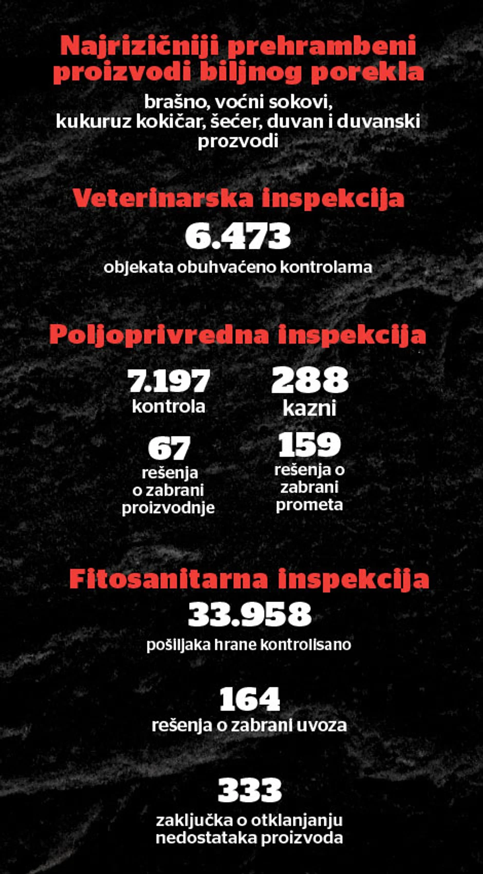 Ove tri inspekcije Ministarstva poljoprivrede i zaštite životne sredine obavile su od 1. januara 2016. godine do danas više od 100.000 što redovnih što vanrednih kontrola tokom kojih su uklonile iz prometa čak 721,9 tona hrane i 54 tone pića zbog nepoštovanja procedura ispitivanja kvaliteta, isteka roka trajanja, nepropisnog deklarisanja, neispunjavanja uslova za proizvodnju ili nepoštovanja zakonskih propisa.