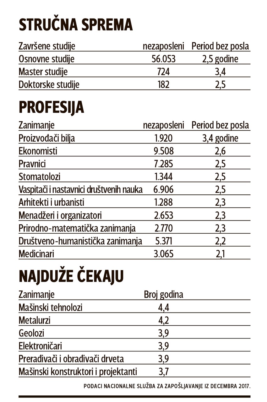 I dok fakultetski obrazovani ljudi u proseku traže posao dve i po godine (29,96 meseci), mašinski tehnolozi čekaju skoro duplo više, čak 52,31 mesec. Strpljenje je potrebno i onima koji su se školovali za geologe, elektroničare, mašinske konstruktore i projektante, mašinske tehnologe...