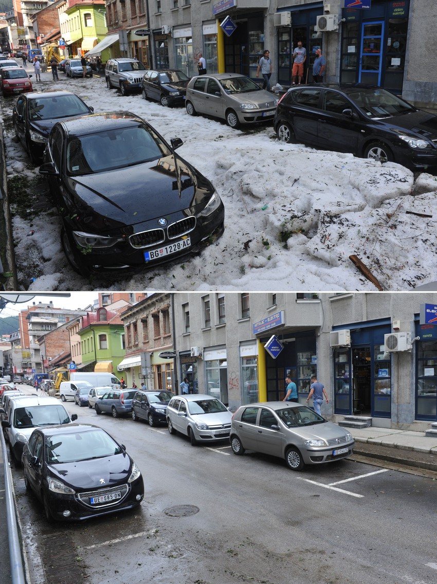 Za samo sat vremena juče popodne na Užice se sručilo 29,3 litra kiše, praćene gradom veličine lešnika. Sa obzirom na konfiguraciju Užica oko koga se nalaze mnoga naselja u visokim zonama, ogromne količine vode potekle su naniže saobraćajnicima pa su se na najnižim kotama stvorile prave ulične delte.