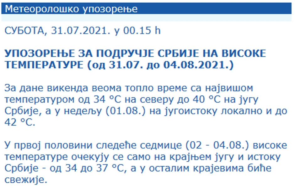 Republički hidrometeorološki zavod izdao je upozorenje na visoke temperature u Srbiji do 4. avgusta.