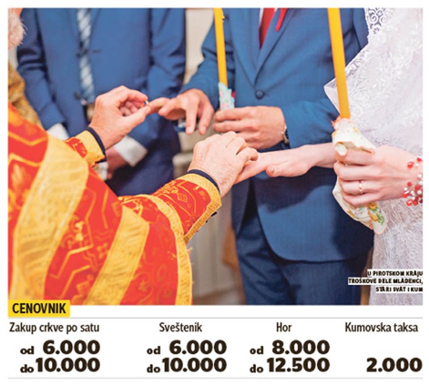 U Jagodini venčanje staje 7.500 dinara, ali manastiri naplaćuju i dodatnu taksu koja zavisi od dogovora. Ni u crkvama u Loznici ne postoji tarifa, već se plaćanje prilagođava mogućnostima vernika. Ipak, svima je poznato da te „mogućnosti“ iznose oko 6.000 dinara u proseku. U valjevskom kraju cena se menja od parohije do parohije, ali se kreće u rasponu od 50 do 100 evra, kako u crkvama tako i u manastirima.
