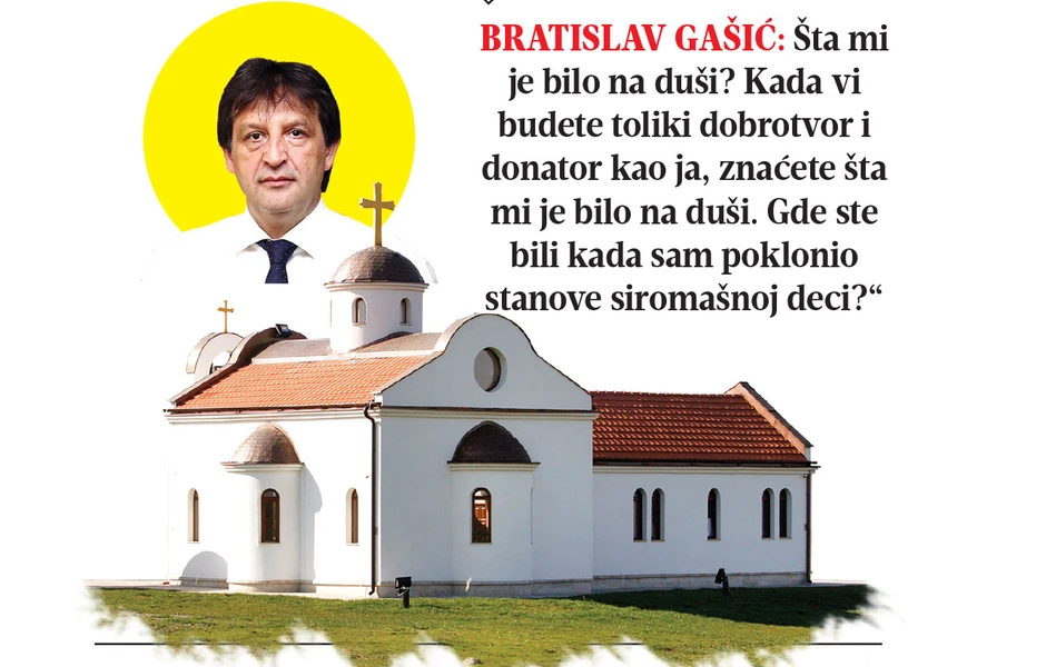 Kapitalnom investicijom u dušu čini se i buduća Crkva Svetog Jovana Krstitelja, koju je na kruševačkom brdu Bagdala podigao bivši ministar odbrane Bratislav Gašić. U njoj se još ne služi, ali je osveštana i skoro spremna za vernike. Na spomen-plaketi kraj glavnih crkvenih vrata Bratislav Gašić i njegov „brat, roditelji i članovi porodica“ nalaze se u društvu „Svetog proroka, preteče i krstitelja Gospodnjeg Jovana“, pri dnu se našlo mesta i za patrijarha Irineja... veličina slova u prezimenu ktitora ne ostavlja sumnju da Gašić zaostaje za Markovićem u hrišćanskoj skromnosti. Crkva nije oslikana, ali obližnja kapela jeste, a u njoj je, među uobičajenim junacima fresaka, i figura sa odelom, kravatom i cipelama, koja trenutno nema lice, ali će očito postati Bratislav Gašić. Bivši ministar nam je prvo tražio da pitanja o gradnji prosledimo informativnoj službi SNS, a na opasku da ta služba ne može da zna šta mu je bilo na duši kada je počeo da gradi crkvu, odgovorio je: