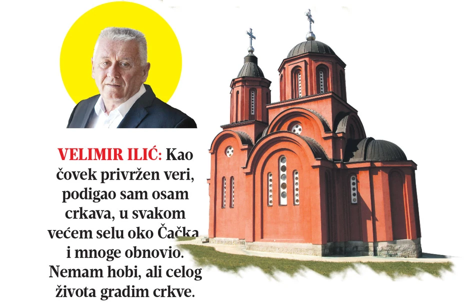Hram rođenja Presvete Bogorodice u Kačulicama, selu pokraj Čačka, pokazao nam je njegov paroh, predusretljivi jerej Bogoljub Simeunović. Nije oslikan - „biće, ako bog da“ - a gradio se od tridesetih godina prošlog veka. Podigli su ga meštani i ministar Velimir Ilić, a bio je, kaže paroh, potreban jer je na dan naše posete na službi imao sedamdeset šest vernika. Sam Velimir Ilić pak za NIN podvlači da crkve veoma mnogo koštaju, pa se zato i dugo zidaju.