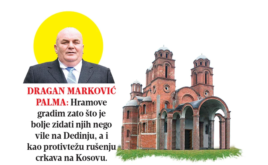 U Eparhiji šumadijskoj, sa sedištem u Kragujevcu, za NIN kažu da je kod njih od 1990. podignuto devet crkava čiji su ktitori privatna lica, a još se tri takve grade. Među ktitorima su i imena poznata javnosti. Hram Svetog Joanikija u Orašcu porodična je zadužbina Olivere Karić Nedeljković, sestre Bogoljuba Karića. Dragan Marković Palma podiže Hram Svetog Jovana Krstitelja u Končarevu, a zadužbina predsednika Srbije Tomislava Nikolića biće Hram Svetog velikomučenika Dimitrija u Bajčetini. Na pitanja NIN-a, Dragan Marković je odgovorio da crkvu u Končarevu, sa šest krstova, pravi isključivo sopstvenim sredstvima i sredstvima sinovljeve firme. Crkva je, kaže, „relativno skromna“. Mada „crkva nikad nije skupa“, trudio se da bude ekonomičan, ali će hram biti oslikan.