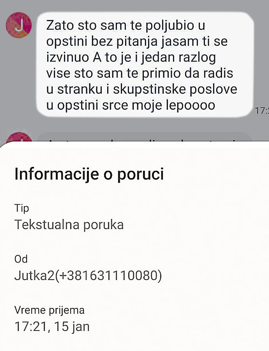 "Zato što sam te poljubio u opštini bez pitanja, ja sam ti se izvinuo A to je i jedan razlog više što sam te primio da radiš u stranku i skupštinske poslove u opštini srce moje lepoooo", napisao je Jutka.