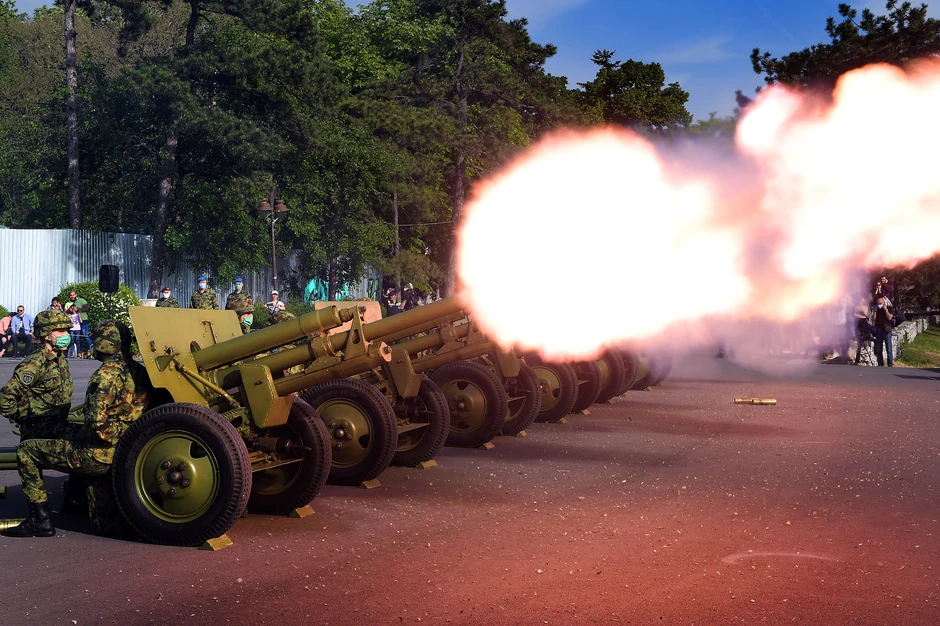 Povodom 9. maja - Dana pobede nad fašizmom, pripadnici Garde Vojske Srbije izvršili su počasnu paljbu sa Savske terase na Kalemegdanu ispaljivanjem deset plotuna iz šest artiljerijskih oruđa.