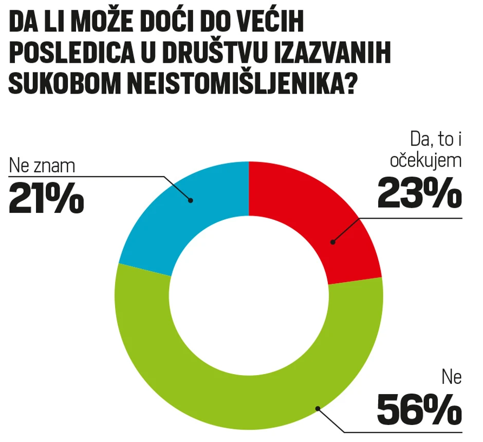Više od polovine ispitanika, njih 56 odsto, ne očekuje da će podele dovesti do većih posledica na društvo. Posledice očekuje 23 odsto, dok 21 odsto ne zna gde bi to moglo da odvede.