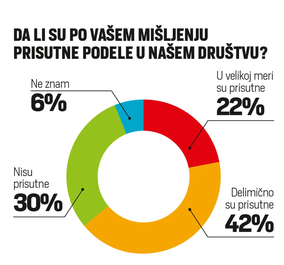Na pitanje da li ima podela u srpskom društvu, 42 odsto ispitanika reklo je da su one delimične, 22 odsto da su prisutne u velikoj meri, dok 30 odsto smatra da nisu prisutne, a šest ne zna.