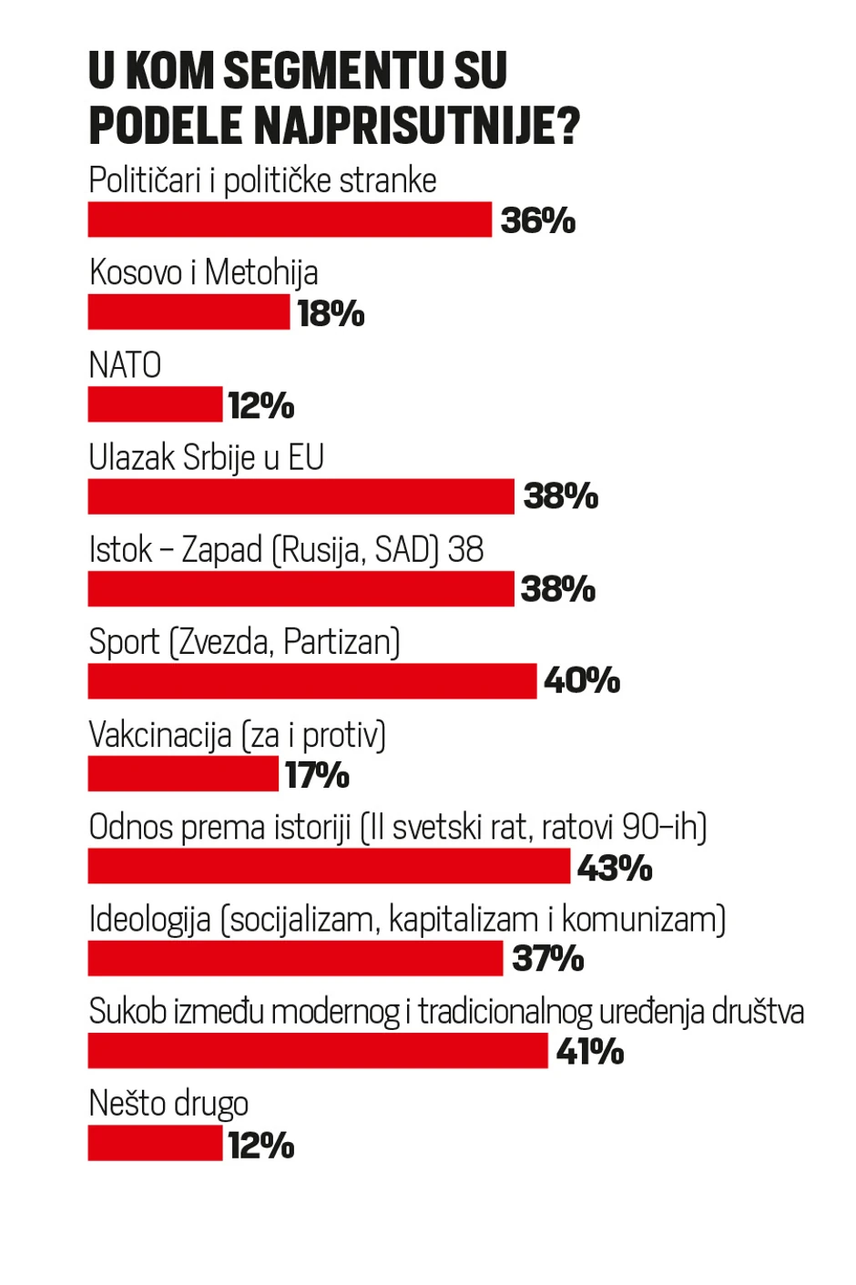 Oblasti u kojima su podele najprisutnije su istorija ili, tačnije rečeno, različiti pogledi na ratove, kako na Drugi svetski, tako i na ratove '90-ih godina. A delimo se i oko modernog i tradicionalnog, zatim oko sporta, odnosno oko Zvezde i Partizana, a potom da li je Srbija bliža Rusiji ili Americi. Ljudi se dele i oko toga treba li naša zemlja da bude deo Evropske unije, oko ideologija, kao i oko političara i političkih stranaka, vakcinacije...
