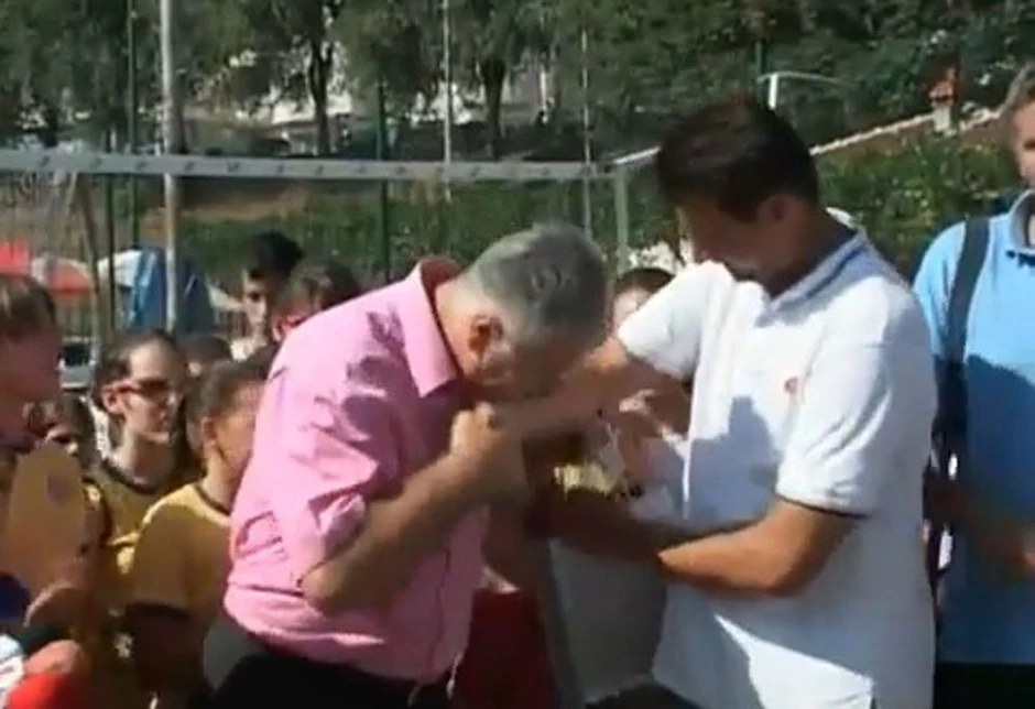 Grbić je spustio glavu, ali predsednik gradske skupštine Kraljeva nije odustajao, pa je odbojkaša na kraju poljubio u ruku.