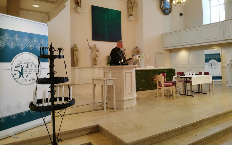 Na skupu je govorio najstariji i prvi rukopoloženi sveštenik Eparhije u Nemačkoj protojerej-stavrofor Slobodan Milunović. U čin sveštenika rukopoložio ga je sadašnji episkop šabački Lavrentije koji je bio prvi episkop Srpske pravoslavne crkve na ovom prostoru.