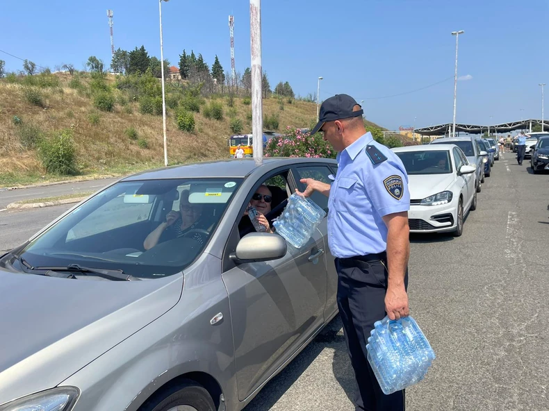 Vozači koji su čekali na graničnom prelazu "Bogorodica" i "Sati Dorjan", kako bi iz Severne Makedonije doputovali u Grčku, mogli su da se osveže dok su bili u redovima, jer su policajci delili flaše vode.