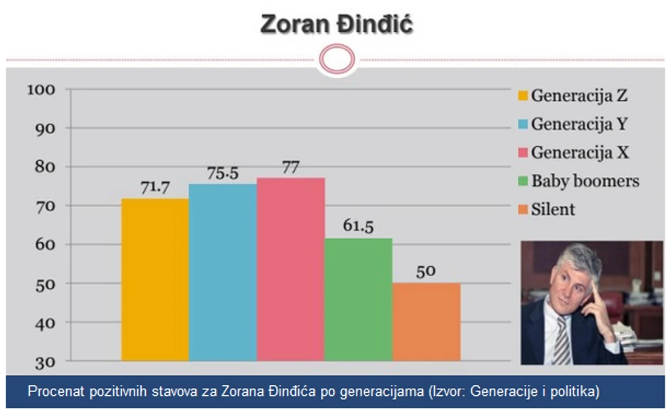 Najviše pozitivnih stavova Đinđić ima kod generacije koja je bila svedok njegove politike. Reč je o generaciji X, između 37 i 49 godina, kod kojih 77 odsto njih smatra da je bivši premijer bio pozitivna ličnost.