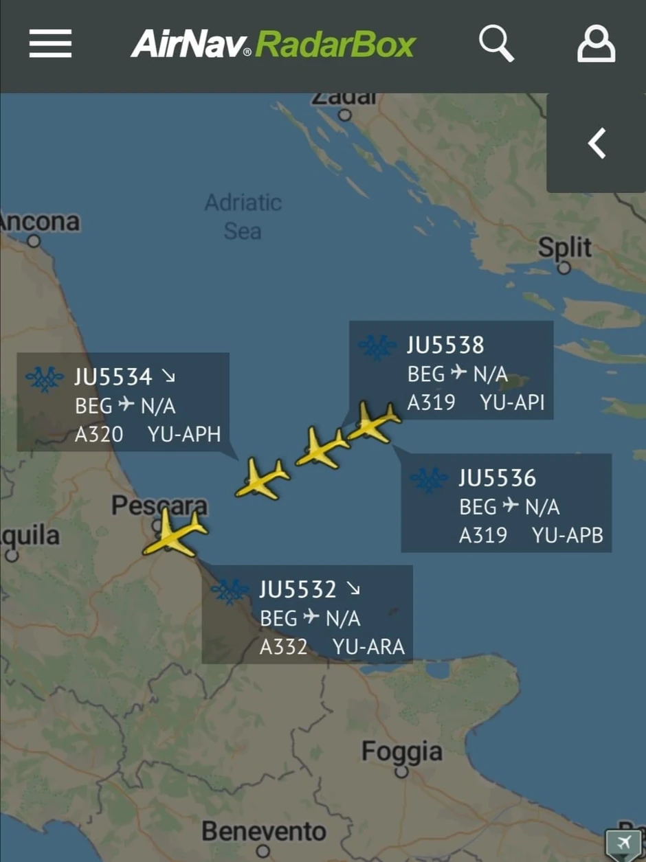 Let 4 naših aviona "Er Srbije" do Italije i nazad u Srbiju, može da se prati na sajtu "RadarBox" .