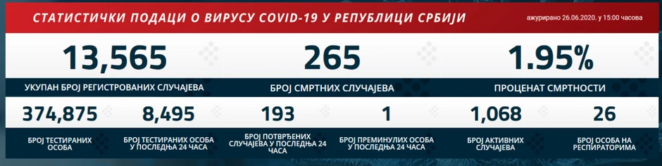 Prema najnovijem preseku stanja objavljenom na sajtu covid19, sada u Srbiji imamo 1.068 aktivnih slučajeva, a ukupno registrovanih od počekta epidemije je 13.565.