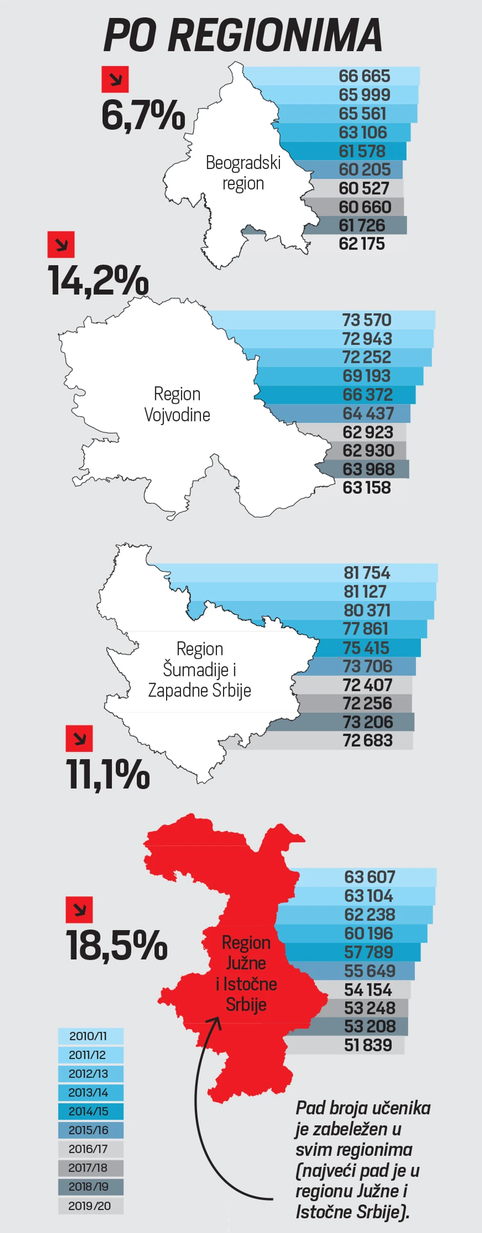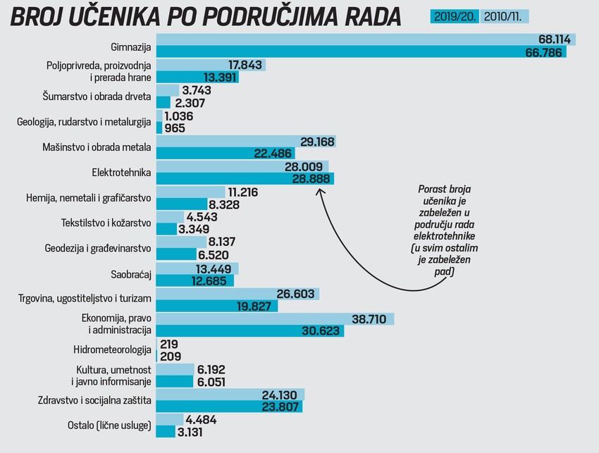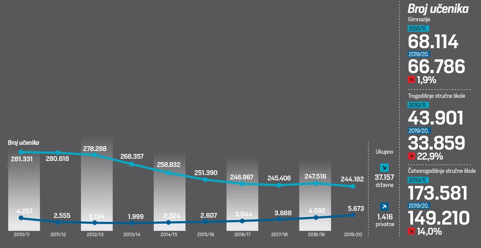 Da bi u prethodnoj školskoj godini 2019/20. broj učenika u državnim srednjim školama bio 244.182, a u privatnim 5.673. Bez obzira na to, što je u privatnim školama broj srednjoškolaca povećan za 1.416, ukupan pad broja učenika srednjih škola je zabrinjavajući i iznosi 12,5 odsto.