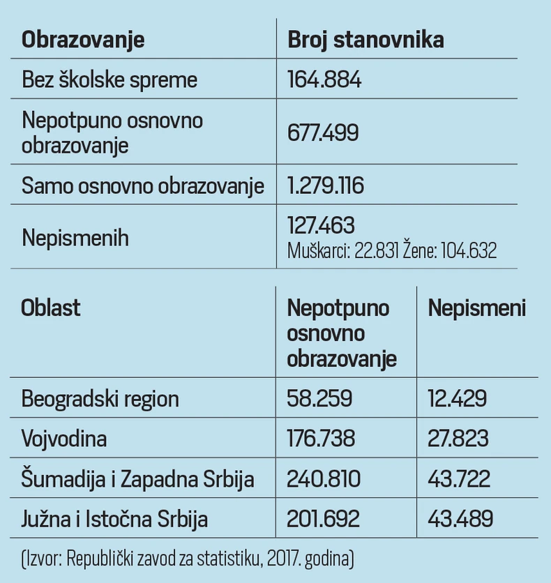 Poražavajući je i podatak da je u Srbiji 2,68 odsto stanovništva bez školske spreme, 11 odsto sa nepotpunim osnovnim obrazovanjem, a 20,76 odsto sa osnovnim obrazovanjem, dok je nepismenih skoro dva odsto (1,96).