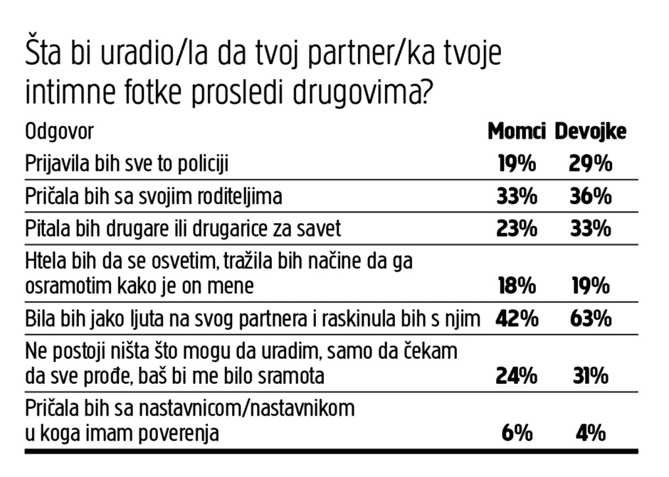 - Iz otvorenih odgovora vidimo da više devojaka ističe da gotovo ne mogu da se zamisle u datoj situaciji jer one "sebi to nikada ne bi dozvolile da se desi", što se čini zabrinjavajuće jer deluje da devojke teret za takvu situaciju stavljaju same na sebe (odnosno na druge devojke). One osećaju da to zavisi isključivo od njih samih, a ne od onih koji su fotografije podelili dalje, a čija je isključiva odgovornost - ističe Pavlovićeva.