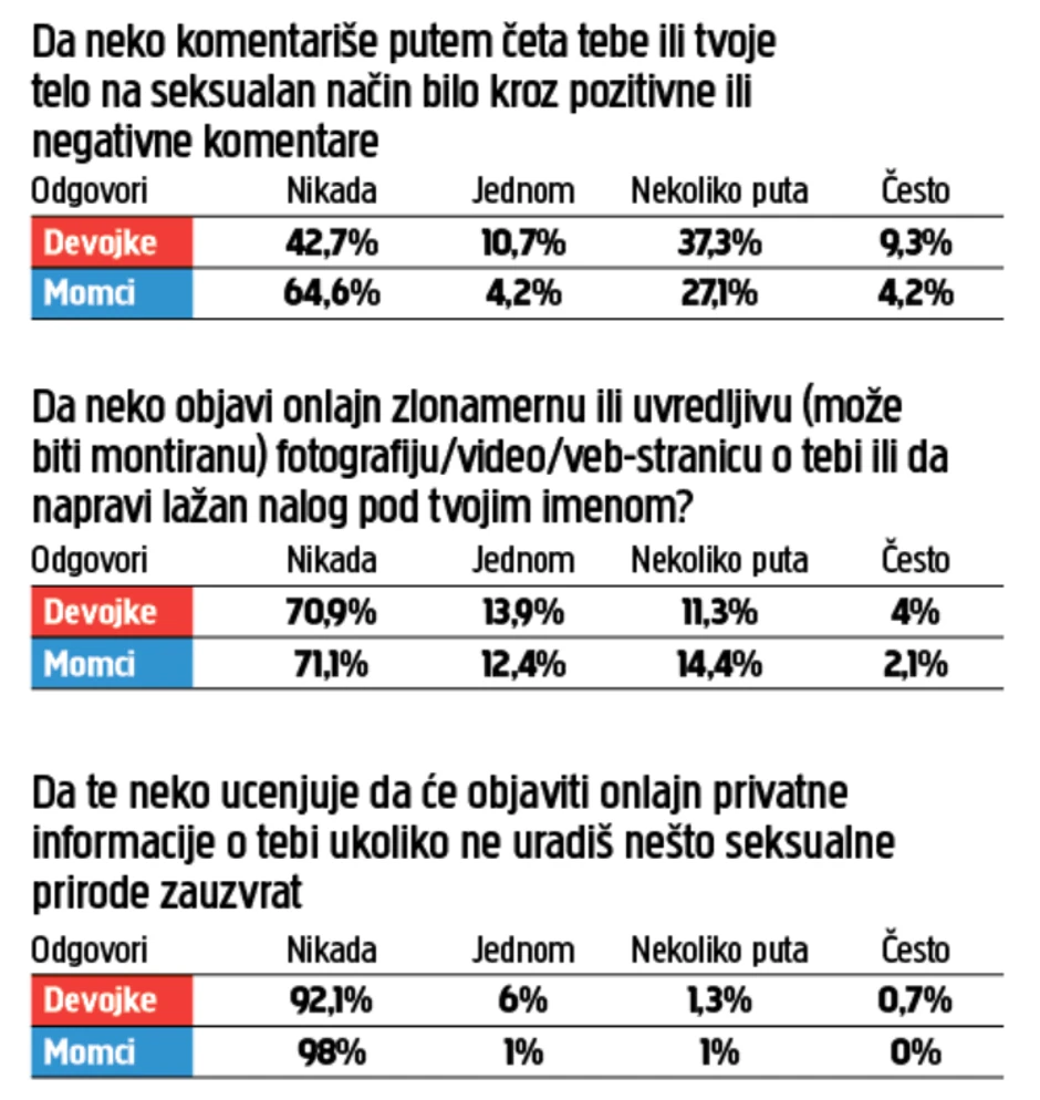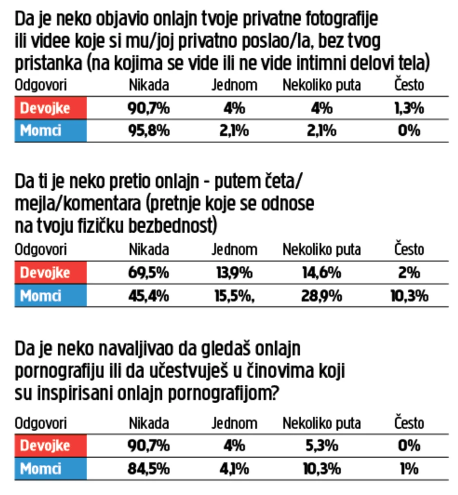 Ovo su svedočenja srednjoškolki iz Srbije koje su pretrpele neki vid digitalnog nasilja. Više od polovine devojaka bilo je izloženo onlajn komentarima seksualne sadržine, a gotovo svaka deseta je doživela da neko objavi njene fotografije koje je toj osobi privatno poslala. Više od polovine momaka istog uzrasta bilo je izloženo onlajn pretnjama fizičkim nasiljem, a 15 odsto njih je doživelo pritisak da gledaju pornografiju.