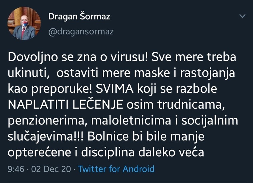 Narodni poslanik SNS Dragan Šormaz izneo je skandalozan stav na Tviteru da bi sve protivepidemiološke mere trebalo ukinuti, a da svima koji se razbole, treba naplatiti lečenje, osim trudnicama, penzionerima, maloletnicima i socijalnim slučajevima?!