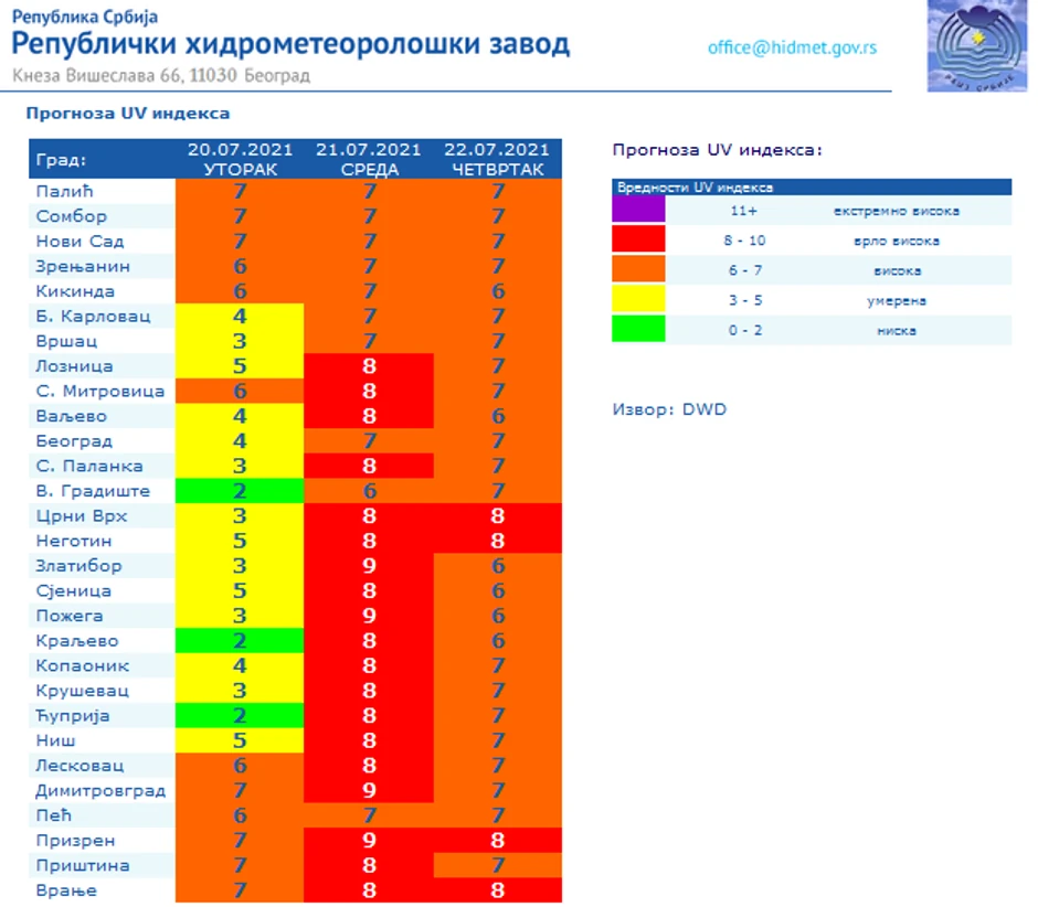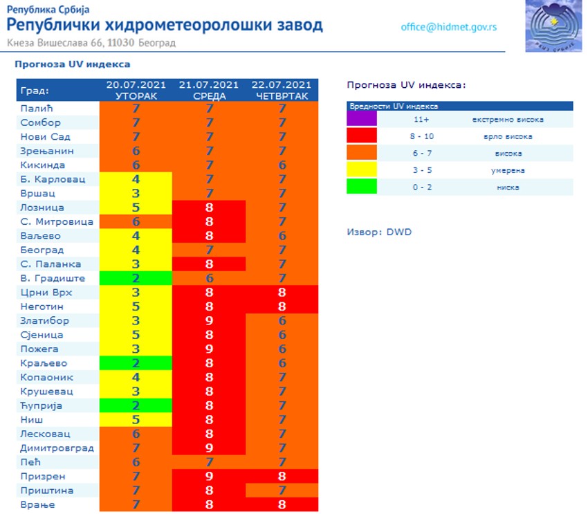 Prema najnovijoj prognozi Republičkog hidrometeorološkog zavoda, konačno nas očekuje period period bez padavina, ali će UV indeks zbog jakog sunčevog zračenja biti u crvenoj zoni koji može biti veoma štetan.