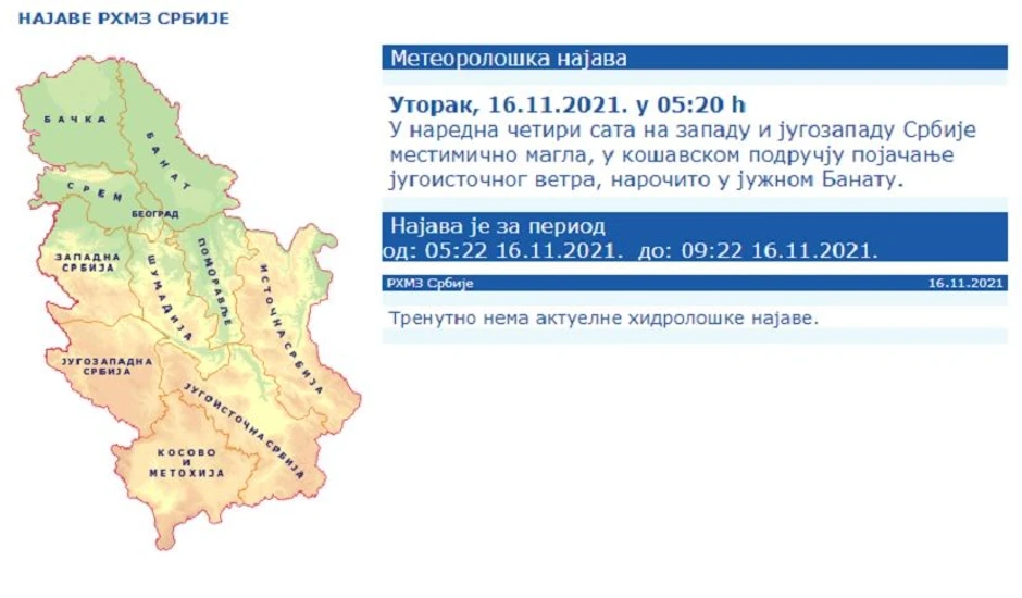 - U naredna četiri sata na zapadu i jugozapadu Srbije mestimično magla, u košavskom području pojačanje jugoistočnog vetra, naročito u južnom Banatu - stoji na sajtu RHMZ.