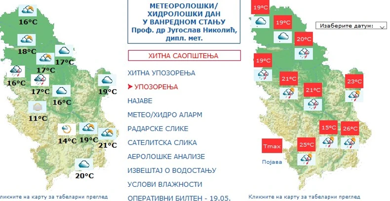 "Dana 19. maja 2020. godine, u poslepodnevnim i večernjim satima, područje Jugozapadne, Centralne i dela Istočne Srbije zahvatila je najavljena olujna nepogoda sa jakim vetrom, pljuskovima kiše i pojavom grada. Nevreme je uslovljeno ciklonom, koji se iz Sredozemlja premeštao prema Balkanu, u sklopu koga se nestabilna i vlažna vazdušna masa, u jugozapadnoj visinskoj struji, premeštala preko pomenutih područja Srbije stvarajući vrlo povoljne uslove za pojavu olujne nepogode", saopštili su iz RHMZ-a.