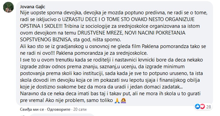 "Nije uopšte sporna devojka, devojka je možda poptuno predivna, ne radi se o tome, radi se isključivo o uzrastu dece i o tome što ovako nešto organizuje opština i škole!!! Tribina iz sociologije za srednjoškolce organizovana sa istom ovom devojkom na temu društvene mreže, novi načini pokretanja sopstvenog biznisa, šta god, ništa sporno".