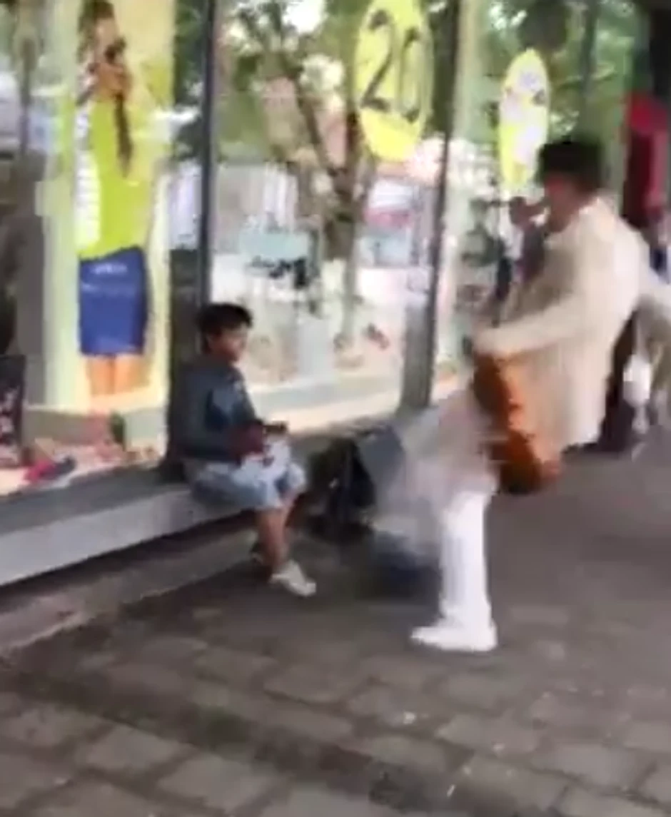 Na snimku je zabeleženo kako violinista, svirajući, polako prilazi dečaku koji sedi ispred jednog izloga i odjednom mu šutira torbu u kojoj skuplja pare. Torba je dečaka udarila pravo u lice.