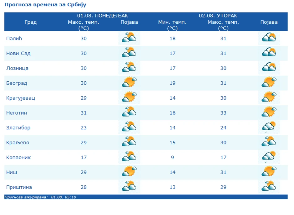 Jutarnja temperatura od 10 do 17, najviša dnevna od 26 do 30 stepeni. Vetar slab i umeren, na istoku povremeno jak, severni i severozapadni, saopštio je Republički hidrometerološki zavod.
