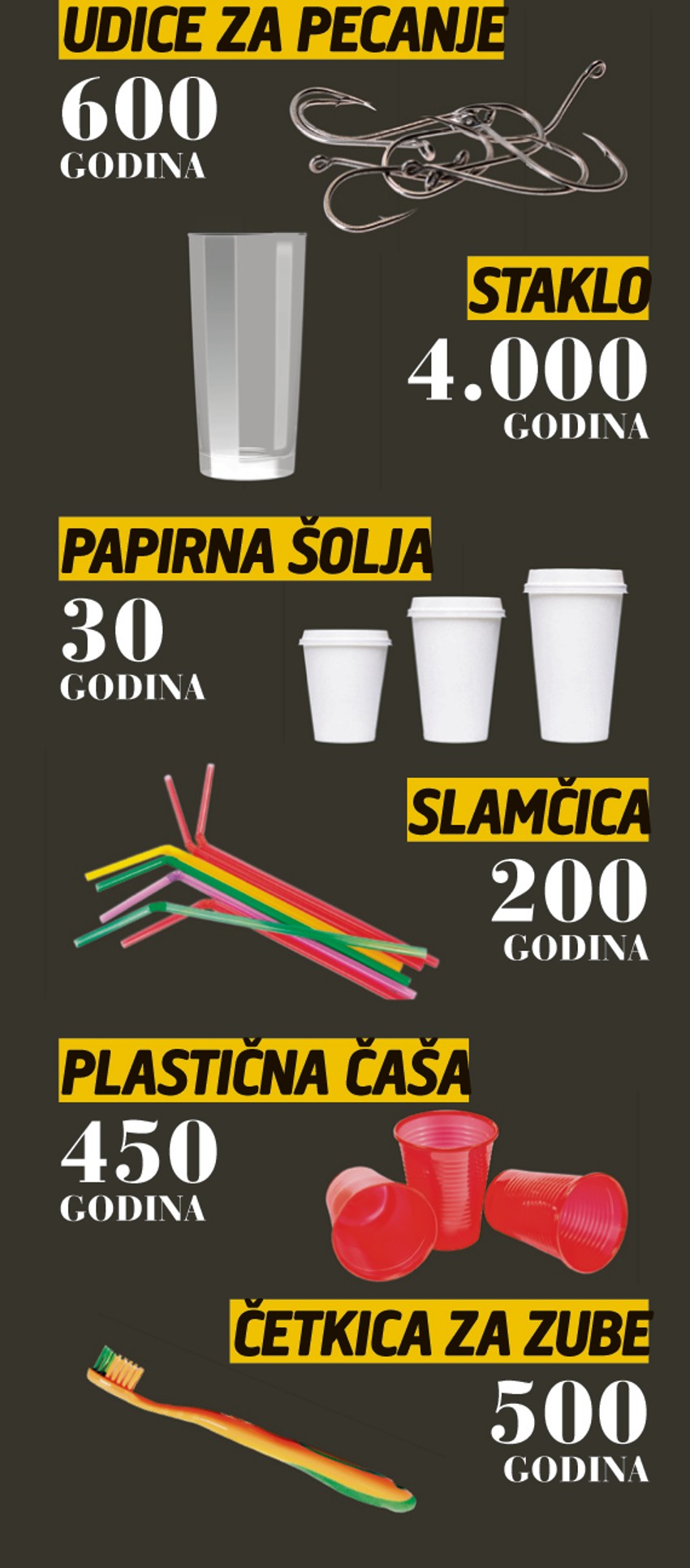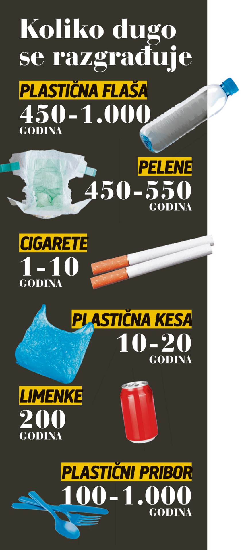 I dok u ovom momentu Srbija reciklira samo šest odsto otpada, prosečni građanin potroši oko 500 kesa za jednokratnu upotrebu godišnje. Da bi se samo jedna nemarno bačena kesa razgradila potrebno je da prođe između 400 i 1.000 godina, a čak i tada razgrađene hemikalije od kojih su napravljene dugo zagađuju okolinu.