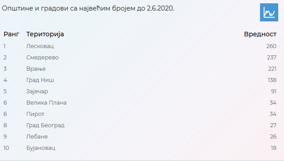 Prema podacima MUP-a Srbije najviše samoizolovanih ima u Leskovcu - 404, slede Kragujevac - 358, Šabac - 317, Niš - 309, Novi Sad - 266, Užice - 265, Beograd - 162, Vranje - 121, Loznica - 114, Brus - 93.