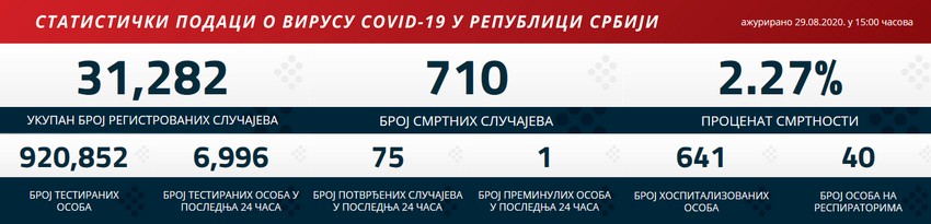 U poslednja 24 sata na korona virus u Srbiji testirano je 6.996 osoba, njih 75 bilo je pozitivno, dok je jedna osoba preminula.
