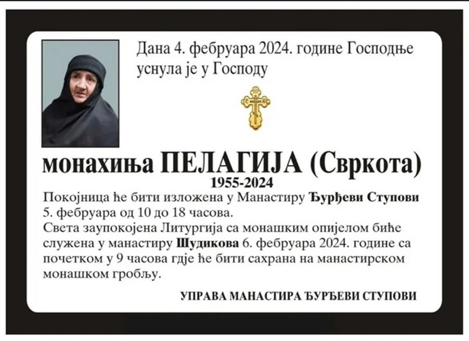 Monahinja mati Pelagija, poznatija kao Svrkota, preminula je, kako je saopšteno iz manastira Đurđevi stupovi Berane. Bila je poštovana članica manastira Šudikova.