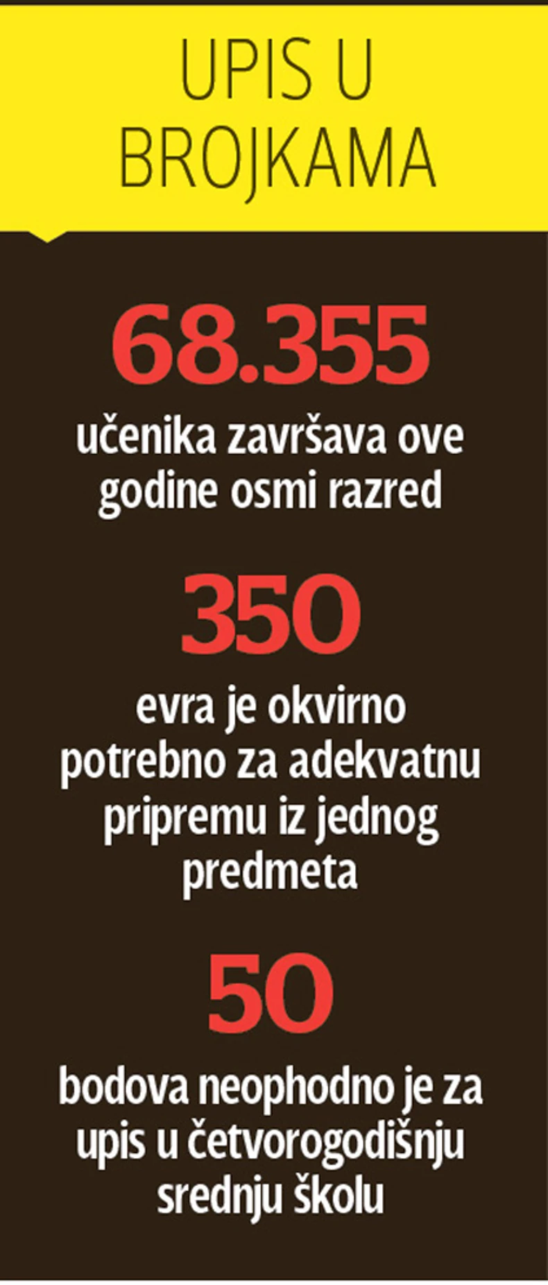 Mnogi osmaci već su počeli pripreme za polaganje završnog ispita. Pripreme se organizuju i u školama, ali se neki odlučuju i za privatne pripreme, koje mogu da koštaju i do 350 evra po predmetu. To je, naime, prosečna cena za 35 dvočasa, što je, prema oceni prosvetnih radnika, minimalan broj časova neophodnih da bi se đak dobro pripremio. Za kvalitetnu pripremu za sva tri testa bilo bi, dakle, potrebno oko 1.000 evra.