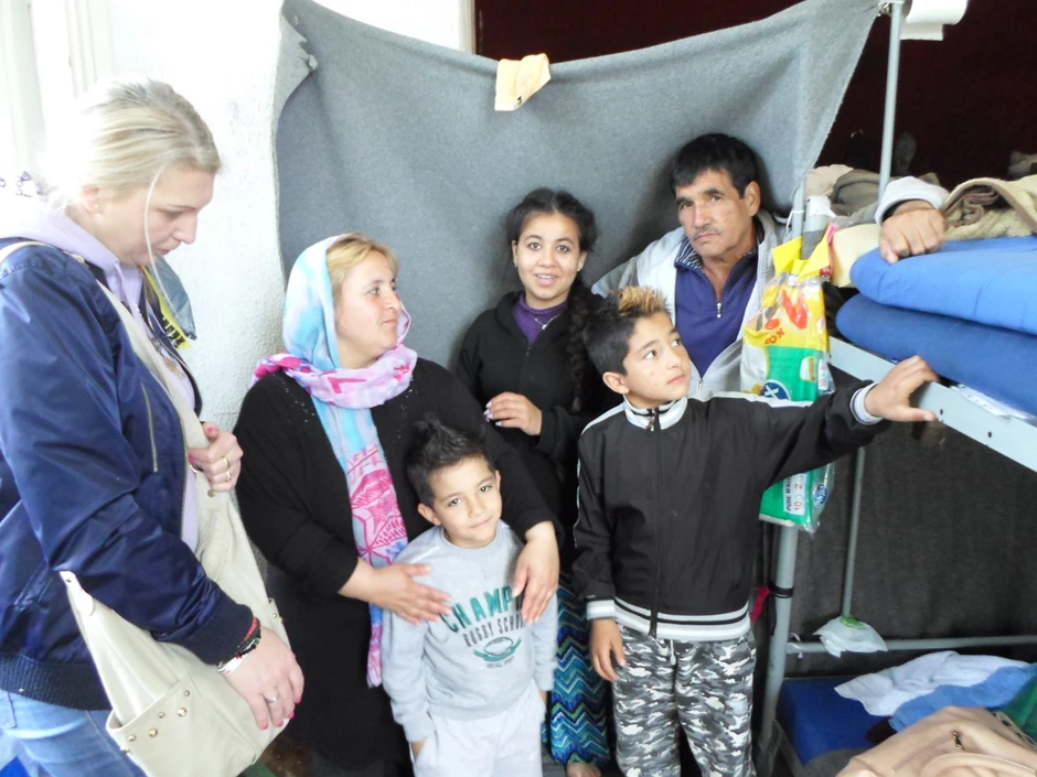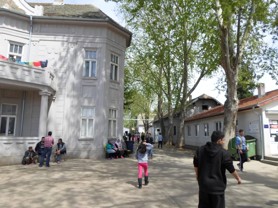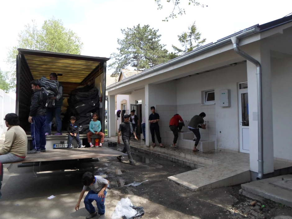 Na klupama sede majke sa malom decom, nekoliko muškaraca pere noge pod slavinom na jednom od sanitarnih čvorova u dvorištu, dok nedaleko od njih volonteri istovaruju čistu ćebad, jer su stari dezinfikovane zbog prisustva vašaka u centru.