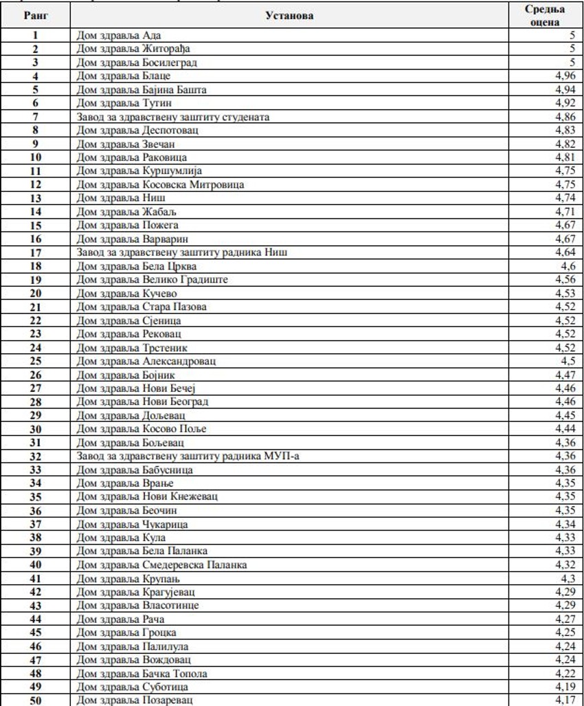 - Tri zdravstvene ustanove beleže najvišu moguću srednju ocenu opšteg zadovoljstva korisnika - 5,00 a to su domovi zdravlja Ada, Žitorađa i Bosilegrad. Srednju ocenu opšteg zadovoljstva koja je ispod proseka na nivou Republike dobile su 82 ustanove. Najniža prosečna ocena iznosi 2,25, dok je 2018. godine bila 2,83.