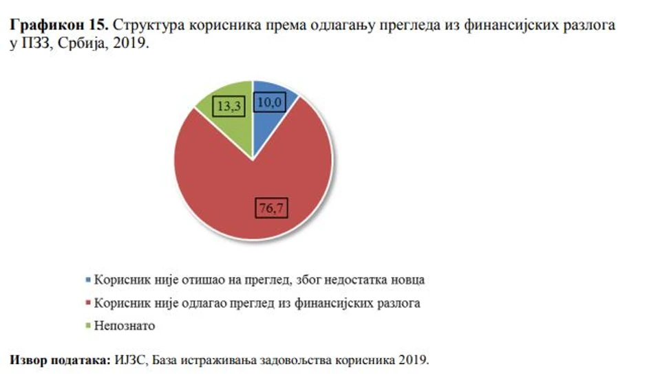 Iako je više od tri četvrtine pacijenata istaklo da je zadovoljno ili čak veoma zadovoljno zdravstvenom zaštitom u Srbiji, svaki deseti korisnik bar jednom nije otišao na pregled kod svog izabranog lekara ili ga je odložio zato što nije imao dovoljno novca da plati lekove ili participaciju.