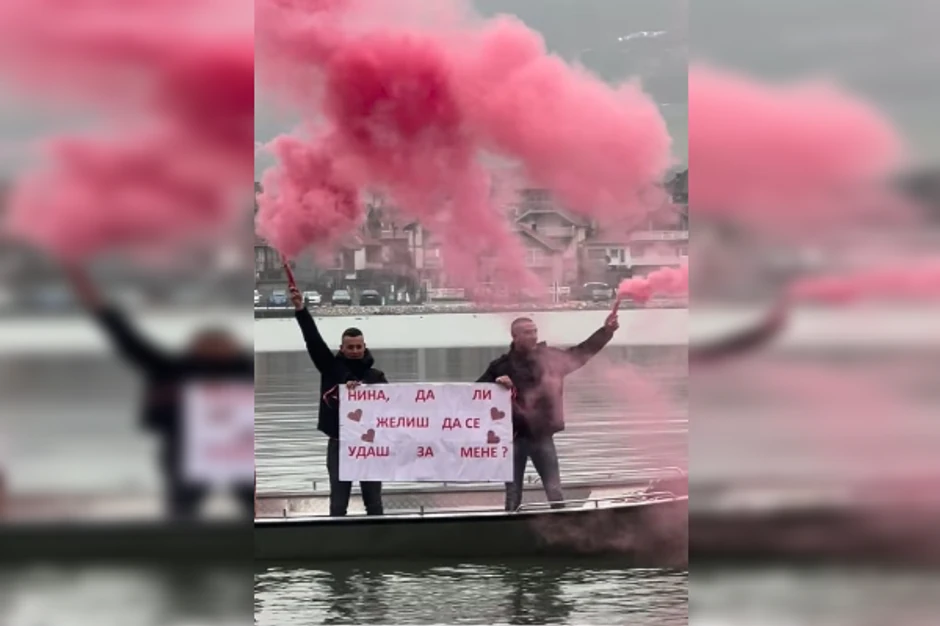 Uz crveni dim, sa čamca na Zvorničkom jezeru u kom su bili sveštenik i dvojica mladića zavijorio se i transparent na kojem je pisalo: "Nina, da li želiš da se udaš za mene?"