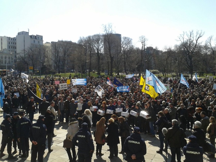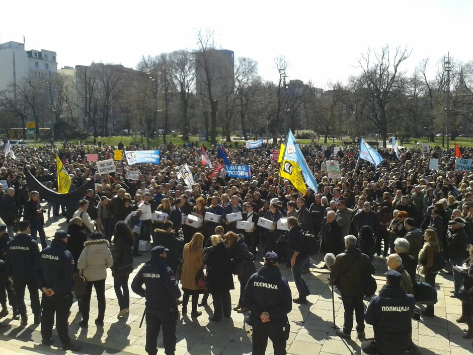 Protest na beogradskom Trgu Nikole Pašića organizuju Unija sindikata prosvetnih radnika Srbije i Sindikat radnika u prosveti Srbije, a protestna šetnja je počela u podne.