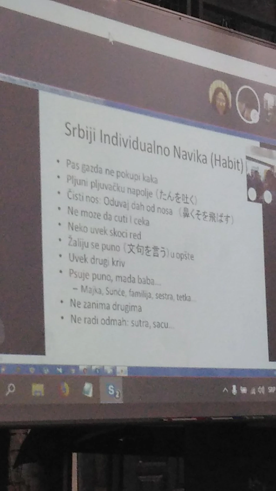 "Uvek drugi kriv", "psuje puno, mada baba", "pljuni pljuvačku napolje", "ne može da ćuti i čeka" - neke su od zamerki na navike Srba, koje je izložila jedna Japanka u okviru razgovora "Srbija i Japan na mostu svakodnevice", održanom u Nišu 3. jula.