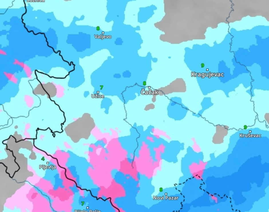 Već u ponedeljak u ranim jutarnjim satima očekuje se da kiša u zapadnim i jugozapadnim delovima zemlje pređe u sneg. Kako se vidi na radarskim snimcima, sneg će padati u okolini Nove Varoši, Prijepolja, Ivanjice, Sjenice, Kušića...
