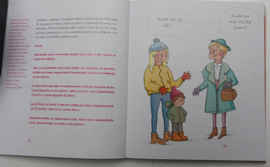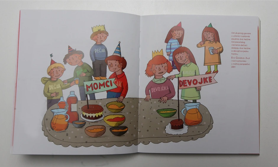 - Knjiga se protivi vaspitanju koje devojčice zatrpava pričama o šopingu, šminkanju i domaćinstvu, a dečacima nudi nauku, sport i pustolovinu, kao i svim drugim elementima vaspitanja koji stvaraju buduće neravnopravne odnose među polovima - kaže Marinkovićeva.